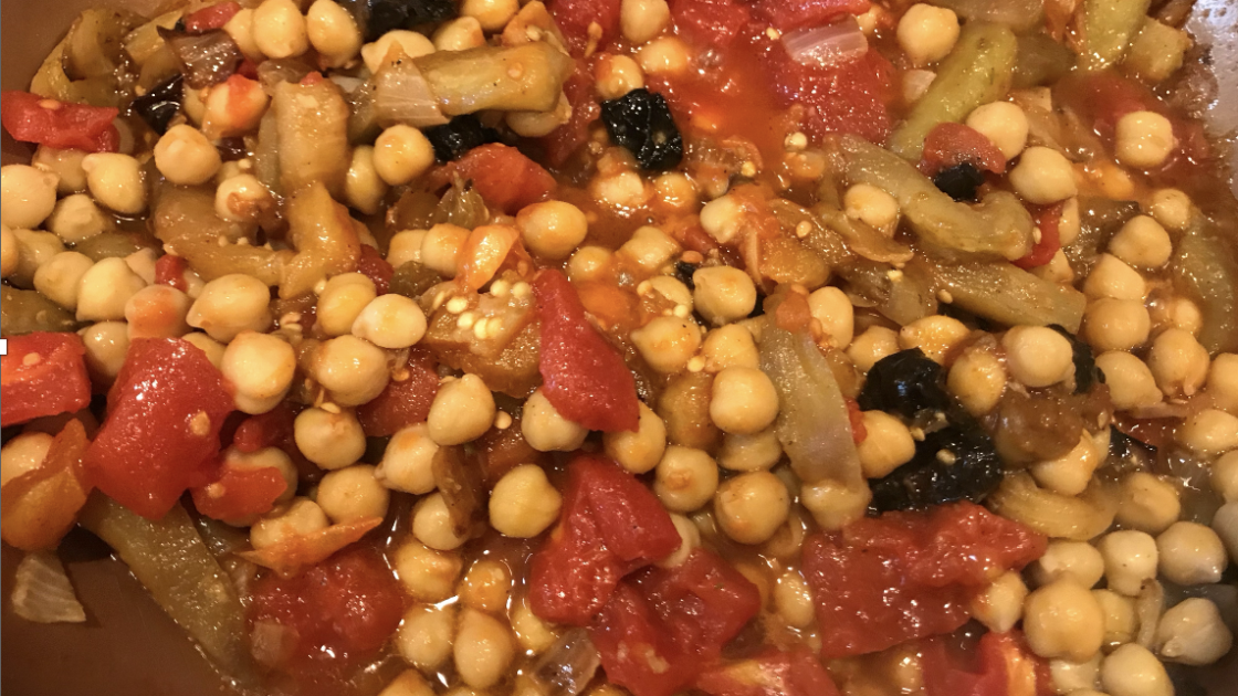 Sautee eggplant strips, onion, and garlic with salt + pepper. Add most or all of the tomatoes, chickpeas, and dried fruit. Add 1 teaspoon dried spices